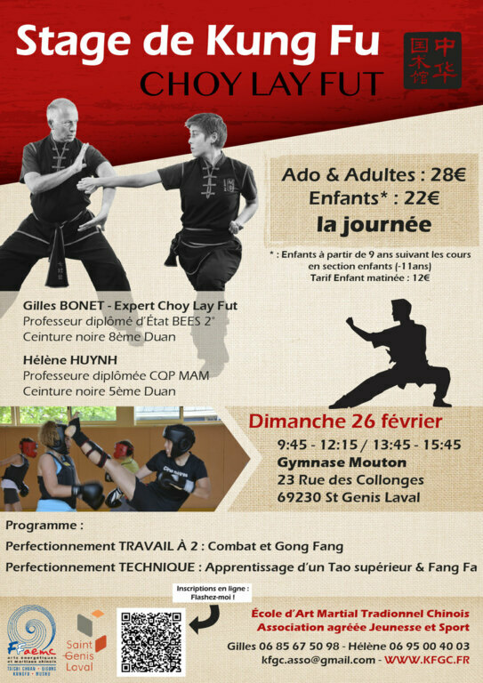 Le prochain Stage de Kung Fu CHOY LAY FUT avec Maître G.Bonet 8ème Duan, aura lieu dimanche 26 décembre à St Genis Laval.